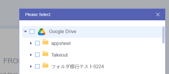 GoogleWorkspaceアカウントのマイドライブ直下にインポートする場合は、Google Driveという部分を選択します。