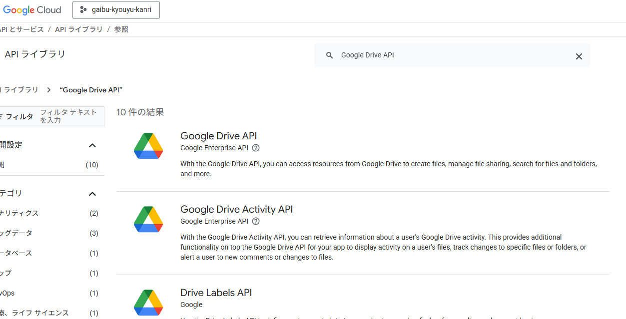 google drive APIとGoogle Drive Activity APIの2つを選択して、有効化してください。