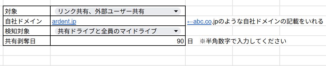 次に自社ドメインを入力して下さい。自社ドメイン内のユーザーに対する共有は解除されないようにするためです。