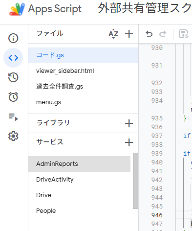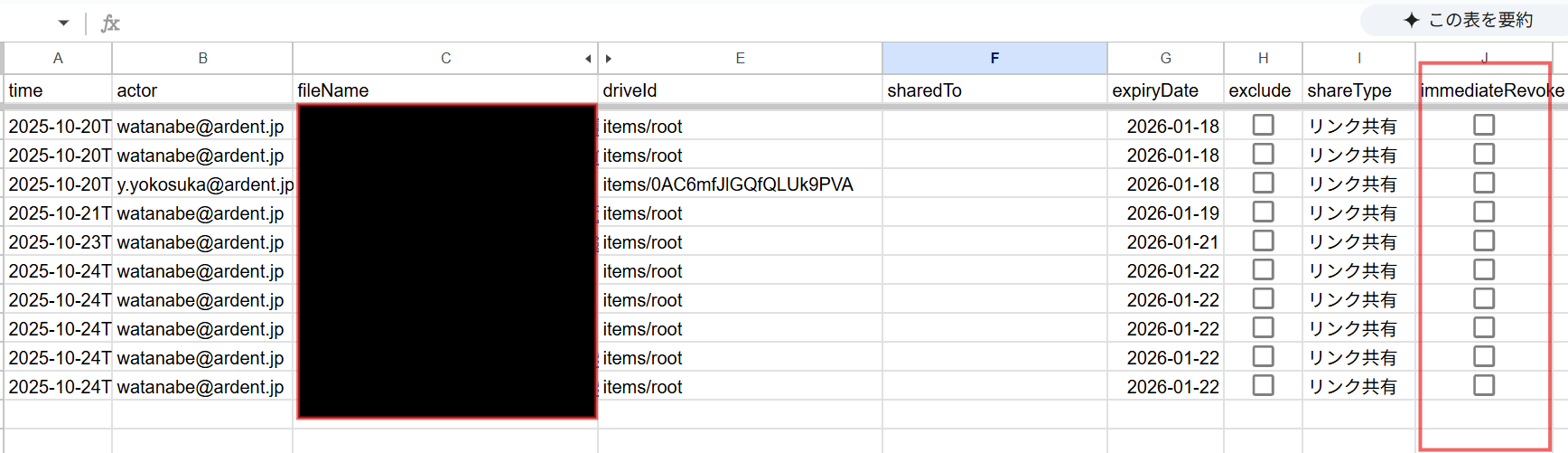 こちらでは、Googleドライブ内の全ファイルをリストアップし、共有状況をチェックします。過去全部を確認するため、時間がかかります。また、新しく共有されたものを確認するには、量が多すぎて少し見づらいです。
