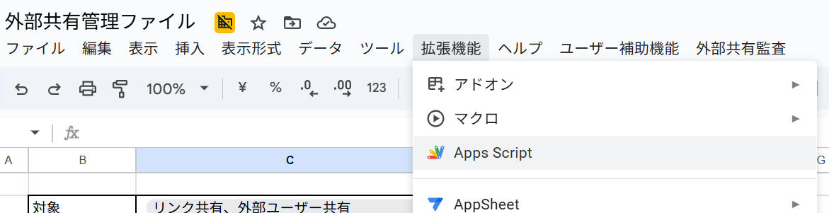 スプレッドシートを開いたら、拡張機能 > apps scriptを選択します。