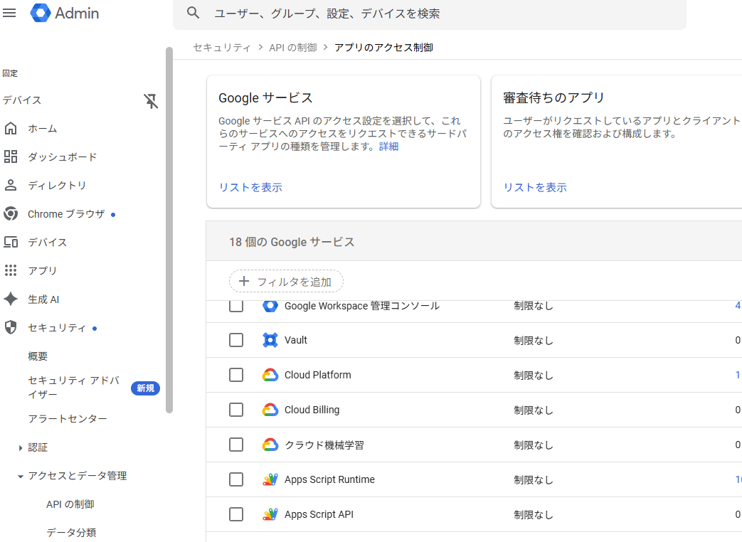 セキュリティ > APIの制御 > アプリのアクセス制御 > Google サービス