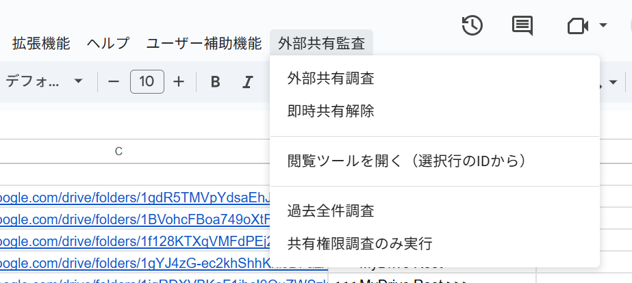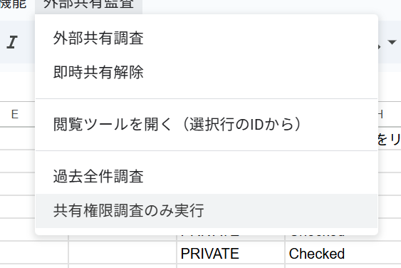スプレッドシート上部にある「外部共有監査」を選択し、過去全件調査を実行します。