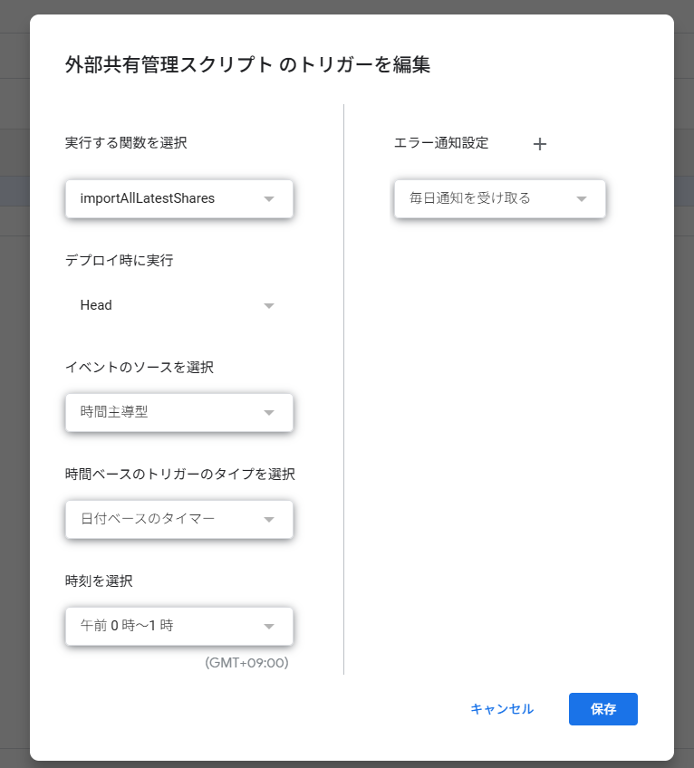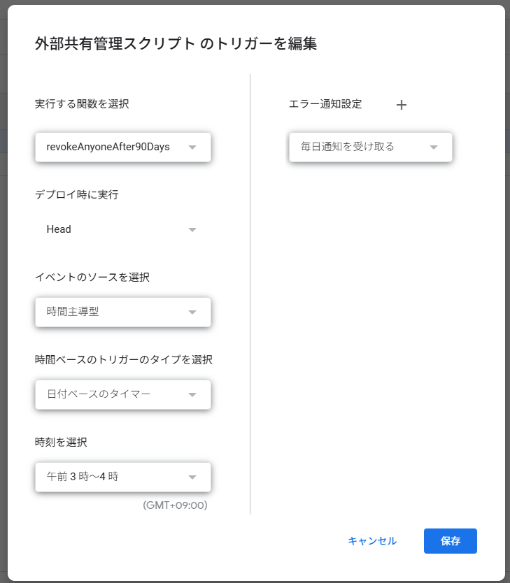 次の画面で、右下の「トリガーを追加」を押して、以下のように設定してください。