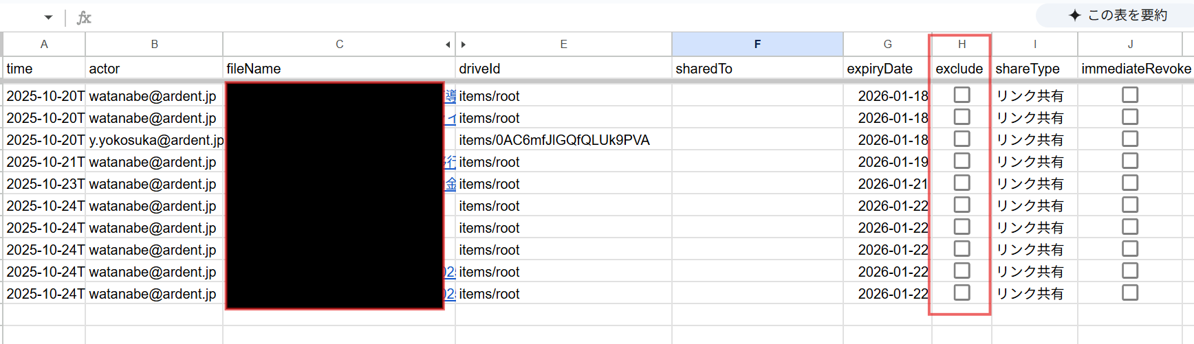 G列が「ANYONE_WITH_LINK」になると、リンク共有をしているということになります。