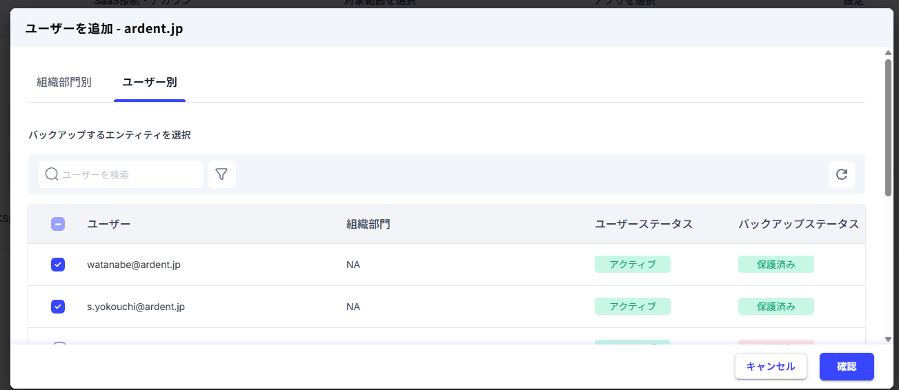 バックアップ対象は、組織別、もしくはユーザー別に設定できます。